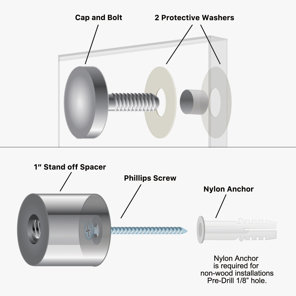 • 1 inch Chrome Finished Standoff Hardware + Mounting Screws