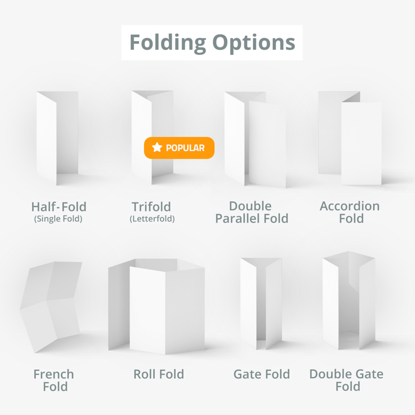 | Paper Fold | Flat (No Folding), Tri-Fold / Letter-Fold, Half-Fold, Z-Fold, Double Parallel Fold, Right-Angle Half Fold, Gate Fold, Double-Gate Fold, Accordion Fold |