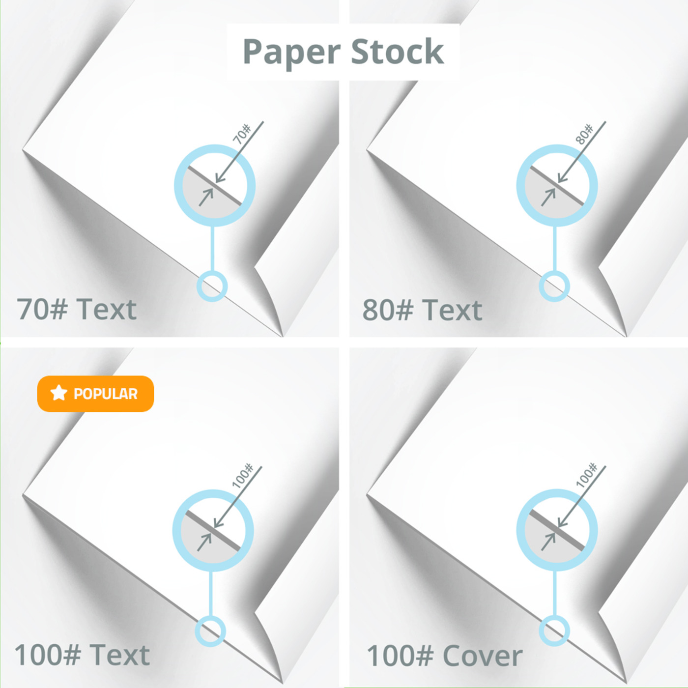 | Paper | 100lb. Gloss Text, 70 lb. Recycled Matt Text, 100lb. Gloss Cover, 80 lb. Recycled Matte Cover, 13 pt. Matte Cover, 13 pt. 100% Recycled Matte Cover, 80 lb. 100% Recycled Uncoated Text, Brilliant White 80 lb. Linen Text, Natural White 80 lb. Linen Text |