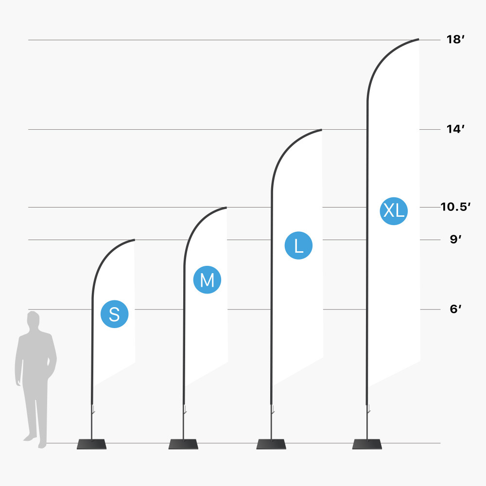 Feather Angled Flags tower over the competition—take advertising to new heights with these full color skyscrapers. With several base options they can be displayed indoors and outdoors.