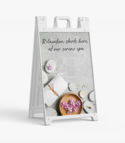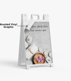 This heavy-duty plastic A-frame is the perfect solution for sidewalk advertising. The frame can be filled with sand or water for greater stability. The hardware includes recessed sign areas that help to protect the vinyl sign faces. Available single sided (front graphic) or double sided (graphics front and back), prints are UV printed on adhesive vinyl and mounted to the Signicade before shipping.